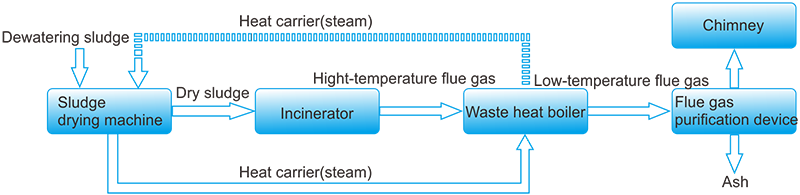 The sludge drying and incinerating technology which our company provides is used to dty the sludge in the way of waste treatment, so that ensure the heat balance between drying and burning . This kind of technology uses the steam from waste heat boiler to dry the sludge indirectly, reducing moisture content to 30%-40%. In addition, we use our proprietary sludge incineration technology for burning, decomposing and fixing the toxic and harmful substances in sludge and make full use of heat energy generated from the sludge during incinerating process.