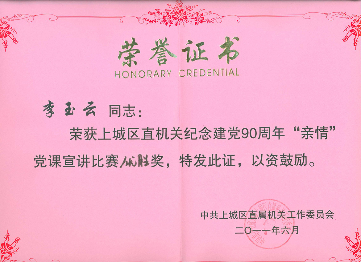 一、參加上城區直(zhí)機關紀念建黨90周年“親情”黨課演講比賽,李玉雲同誌(zhì)喜獲三(sān)等獎