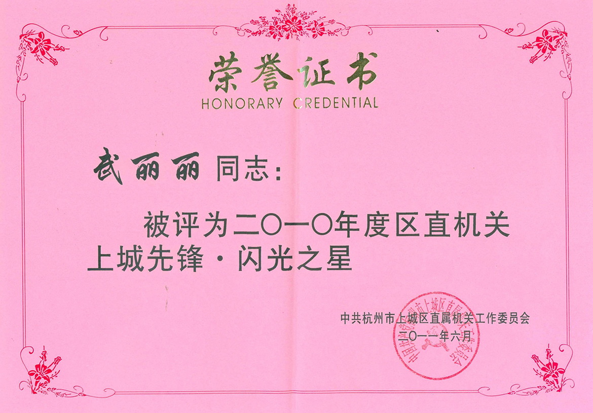 祝賀我公司員工武麗麗同誌,被中共杭州市上城區直屬(shǔ)機關工作委員會評為二〇一〇年度區直機(jī)關上城先(xiān)鋒·閃光之星(xīng)