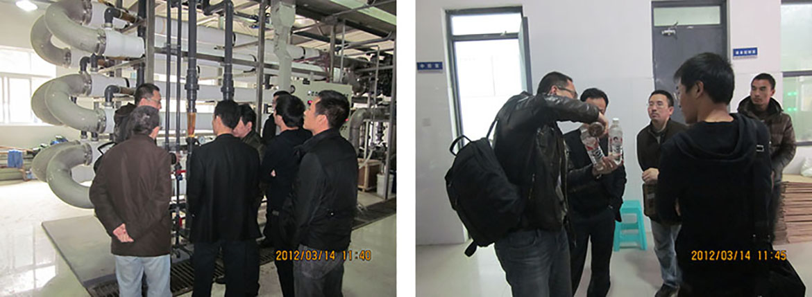 象山考察團邊參觀邊提出了自己的問題和看法,劉經(jīng)理和王經理非常(cháng)全麵(miàn)的解答了他們(men)的問題,並(bìng)向他們展示了分別經過超濾、納濾、反滲透(tòu)三套裝置處理後的水樣進行對比,從外觀顏色就可以明顯的(de)看出處理(lǐ)效果,超濾(lǜ)產水顏色略黃,納濾、反滲透產水清澈透明,王經理詳細的解釋了三種膜的不同結構和處理原理,象山考察團對三套裝置(zhì)的處理效果非常滿意,肯定了這一高(gāo)新技術,計(jì)劃對象山水桶嶴垃圾場的滲濾液處理站進行改造,投資增加安裝膜係統(tǒng),以使滲濾液處理更有效的達到(dào)排放標(biāo)準,對方也期望我公(gōng)司在投(tóu)資成本(běn)上給予優惠。