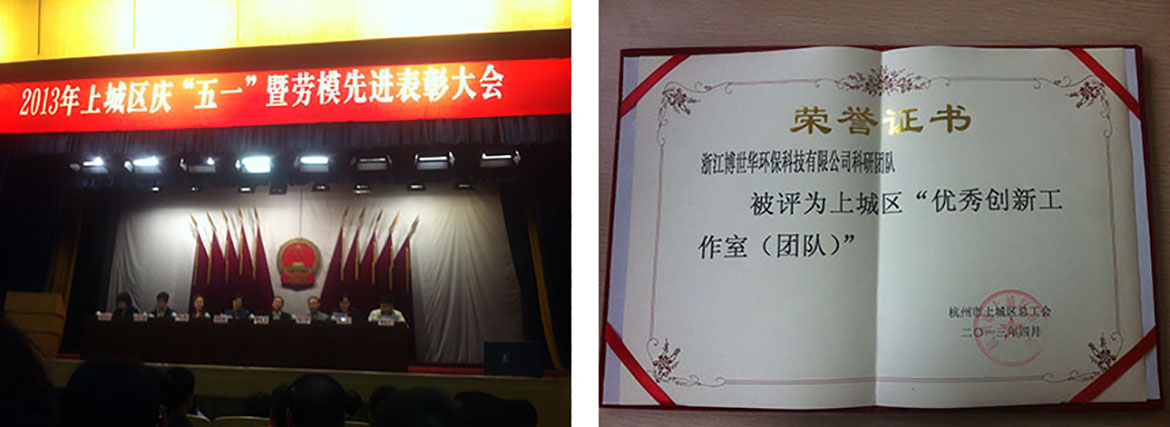 2013年4月26日,在2013年(nián)上城區慶“五一”暨勞模先進表彰大會上,浙江博世華環保科技有限(xiàn)公司科研團隊,經申報評議,被上城區總工會授予“上城區優秀創新團隊”榮譽稱號。