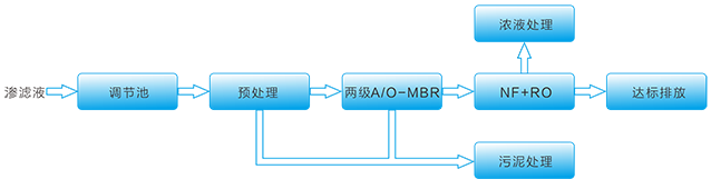 滲濾液由調節池均勻水質水量後,提升經預處(chù)理係(xì)統去除懸浮(fú)物預處理後進入外置MBR係統。MBR係統由二部分組成,兩級A/O生化係統和外置管式超濾膜係統。MBR膜生物反應出水深度處理係統,其由NF和RO處理係統組(zǔ)成,經(jīng)深度處理(lǐ)後,達(dá)標排放(fàng)。